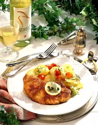 Heat the remaining oil in a frying pan and fry the escalopes in it at medium heat for 3-4 minutes on each side. Arrange Wiener Schnitzel and potato salad on plates and serve garnished as desired with capers, 1 slice of lemon and chives.