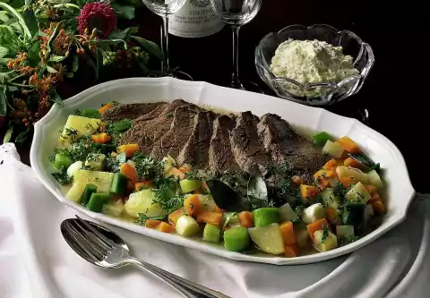 Remove the boiled beef from the stock and cut into slices. Remove larded onion from the stock. Season stock with salt and pepper. Meat, vegetables and some stock (you can use the rest of the stock as a light starter for dinner, for example).