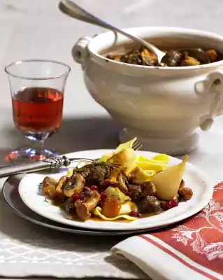 Drain and let drain. Season goulash with salt, pepper and possibly Jägermeister. Serve goulash with the noodles. Pears and cranberries taste good with it.