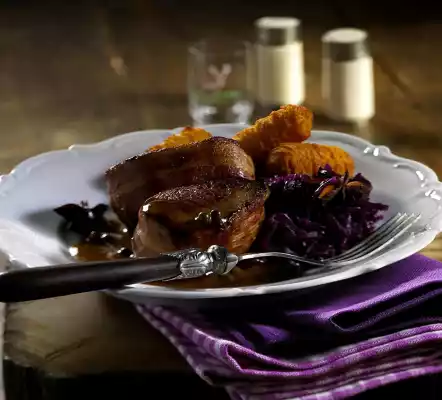 Heat clarified butter in a pot. Add red cabbage, cloves and star anise. Cover and braise at low heat for about 20 minutes, stirring several times. Wash the meat and dab dry.