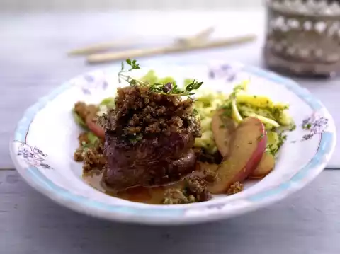 Finely crumble the breakfast cake. Wash herbs, shake dry. Chop parsley and rosemary needles separately very finely. Pluck thyme. Mix breakfast cake, nuts, mustard, 1 tablespoon butter, thyme, rosemary and half of the parsley well.