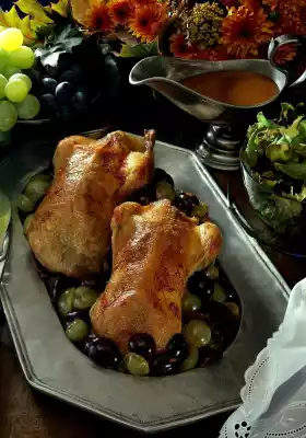 Pour in the wine and stock and roast the ducks in the preheated oven (electric range: 200 °C/ gas: level 3) for about 1 1/4 hours. In the meantime, wash, halve and seed the grapes. Remove ducks from the oven and keep warm.
