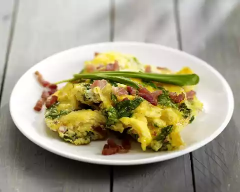 Fry the bacon in a hot pan. Add egg mixture and let it set while stirring. Garnish scrambled eggs with wild garlic.