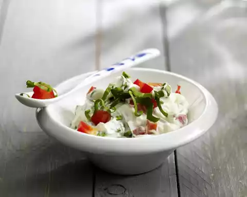 Clean, wash and cut the peppers into small cubes. Wash the wild garlic, dab dry, clean and cut into strips. Stir curd and sour cream until smooth. Stir in wild garlic and paprika, except for a little bit for sprinkling.