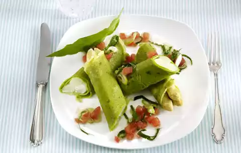 Mix in the tomatoes, spring onions and wild garlic. Spread a flat, coated pan with a little clarified butter. Bake 8 thin crêpes one after the other. Wrap three asparagus spears in each crêpe.