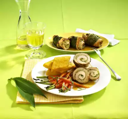 Take out the schnitzel rolls and keep them warm. Fry the carrots in the same pan. Fold in honey and allow to caramelize. Pour in broth and braise for about 2 minutes. Arrange schnitzel rolls, polenta and carrots on plates. Sprinkle remaining wild garlic strips over the carrots