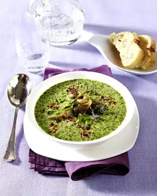 Peel, wash and finely grate the potatoes. Add cream and potato to the soup, bring to the boil and puree finely, season with salt and pepper. Clean and chop the mushrooms. Heat oil in a pan.