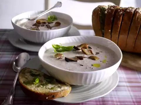 Puree the soup with the chopping stick, season to taste with salt, pepper and lemon juice. Serve the soup, add the remaining mushrooms and garnish with basil. Add garlic parmesan bread.