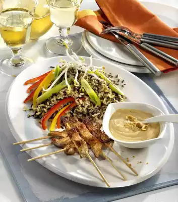 Season with salt and pepper. Mix peanut cream, yoghurt, vinegar and 6 tablespoons of water. Heat oil in a pan and fry the skewers in it for about 2 minutes on each side, deglaze with soy sauce. Mix rice mixture with strips of paprika and spring onions. Serve with saté skewers and peanut sauce. Chop the peanuts a little finer and sprinkle on the sauce