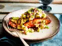 Wash the tomatoes and cut them into slices of about 1 cm wide. Spread on the tray next to the salmon. Season on both sides with salt, pepper, chilli and aniseed. Sprinkle with 3 tablespoons of oil. Bake in the oven for 5-10 minutes.