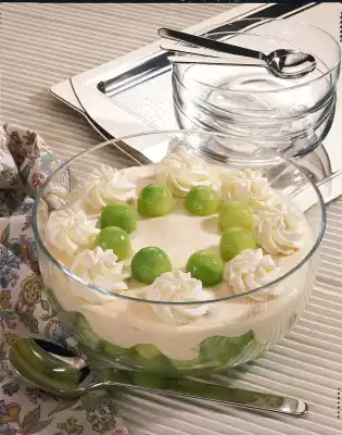 Fill with cream and smooth it down. Spray cream dab onto the cream. Decorate with melon balls and leave to cool slightly.