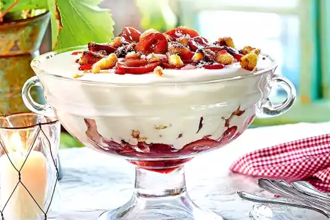 Ca. 2⁄3 Pour the compote into a large bowl. Sprinkle with approx. 2⁄3 biscuit crumbs. Whip cream until stiff and fold into the wine cream in 2 portions. Pour over the crumbs and chill for at least 2 hours. Serve with the rest of the compote and crumbs.