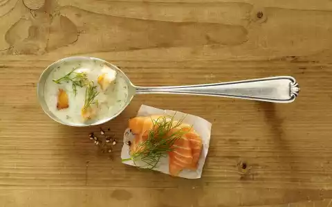 Wash the salmon fillet, dab dry and cut into cubes. Peel and chop the onion. Heat butter in a coated pan and fry the salmon cubes. Season with salt and take out. Sauté onion in frying fat until translucent. Deglaze with white wine and boil down for 3-4 minutes. Add fish stock and simmer covered for about 10 minutes