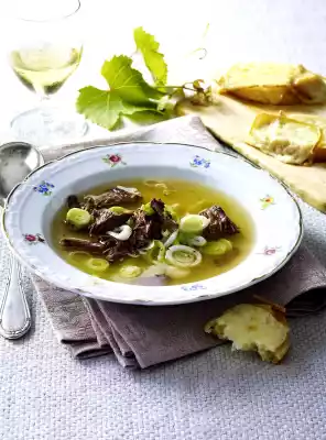 Clean and wash the leek and cut into thin rings. Heat the oil in a pot and fry the leek for about 2 minutes. Deglaze with wine and simmer for 3-4 minutes. Add stock, bring to the boil and simmer for about 8 minutes