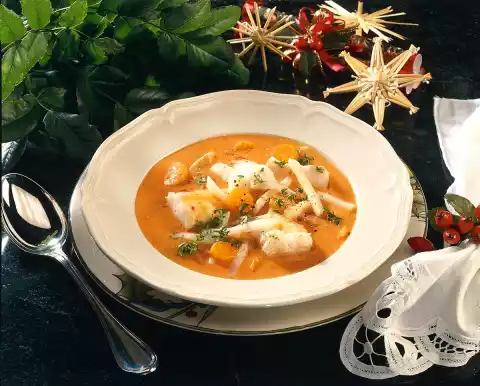 Wash the fish and cut into small pieces. Sprinkle with lemon juice and season with salt and pepper. Peel and wash carrot and celery. Cut carrots into slices and celery into thin sticks. Peel and finely chop the onion. Steam vegetables in hot fat for about 5 minutes. Add tomato paste.