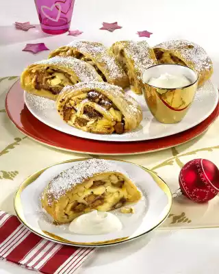 Line baking tray with baking paper. Place the strudel on the tray with the seam side down. Whisk the egg yolk and 1 teaspoon of water. Spread the strudel with it. Bake in the preheated oven on the 2nd rack from below (electric oven: 200 °C/circulating air: 175 °C/gas: level 3) for approx. 30 minutes. Dust with icing sugar. Serve warm with cream or ice cream