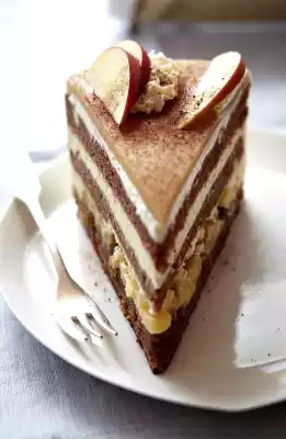 Place the baked apple filling on the bottom, leaving about 2 cm free at the edge. Spread half the apple cream on top. Place the second base on top and brush with 2 tbsp. juice. Spread the rest of the cream on top and place the last cake layer on top.