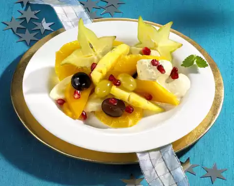 Arrange fruit and gingerbread sauce on plates. Wash the carambola, dab dry and cut into thin slices. Decorate with lemon balm leaves and carambola.