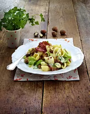 Cook the pasta in boiling salted water according to the instructions on the packet. In the meantime, cut hazelnut kernels in half and roast them in a pan without fat, remove and let them cool down. Fry the rest of the bacon slices in the pan over a low heat, turning them occasionally until crispy. Drain on kitchen paper and break into pieces