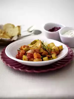 Peel and chop the turnip. Peel, wash and slice the carrots. Clean, wash and slice the celery. Peel and slice onions. Wash rosemary and thyme, shake dry