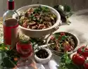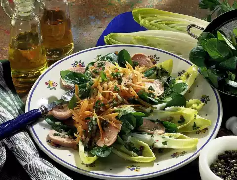 Peel, wash and roughly grate the carrots. Cut the sausage into thin slices. Wash, clean and sort lamb's lettuce. Clean the chicory as well. Loosen leaves, cut off bitter ends. Line plates with the leaves and sprinkle with lemon juice. Mix the remaining prepared ingredients and arrange on top. Peel and finely chop the onion. Wash and chop the herbs. Mix onion and herbs with oil and season with salt, pepper and sugar. Pour the marinade over the salad. Wholemeal bread tastes good with it