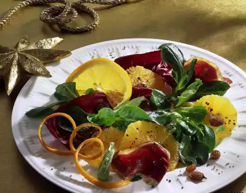Cut oranges into slices. Halve the remaining orange and squeeze the juice. Mix orange juice and vinegar, season with salt, pepper and sugar. Whip the oil into it. Arrange radicchio, lamb's lettuce, orange slices and goose breast on four plates, sprinkle with pepper and sultanas.