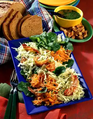 Clean, wash and halve the cabbage and cut out the stalk. Cut the cabbage into fine strips. Clean, peel and roughly grate the carrots. Clean, wash and drain lamb's lettuce. Cut bread into small lozenges. Drain and remove bacon in a pan without fat. Put the bread lozenges in the frying fat and fry them until golden brown while turning. Wash chives, dab dry and cut into small rolls. Mix orange juice and vinegar, season with salt, pepper and sugar and add oil. Stir 2/3 of the chives into the orange vinaigrette. Mix white cabbage, carrots, lamb's lettuce and 2/3 of the bacon, pour the vinaigrette over it and arrange on a plate. Serve the salad garnished with the remaining chives and bacon. Serve with extra bread wedges