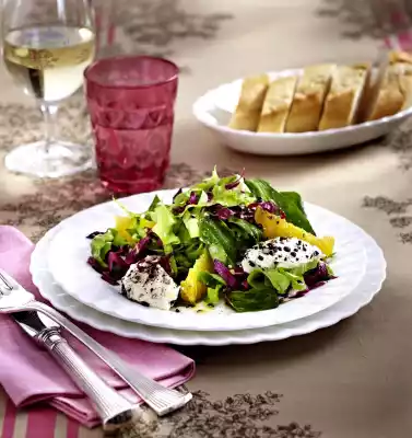 Stir cream cheese until smooth and form 8 cams with two moistened teaspoons. Sprinkle with coarse pepper. Mix salads and oranges with marinade. Arrange on plates and place the cams on top.