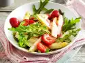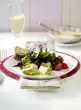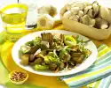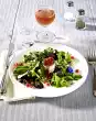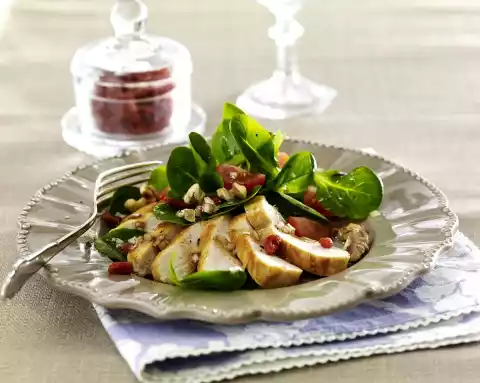 Season vinegar vigorously with salt, pepper and sugar. Add 3 tablespoons of oil drop by drop, stir in onion and berries. Mix salad, vinaigrette and tomatoes. Cut the meat into slices and arrange on plates with the salad, sprinkle with nuts.