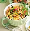 Meanwhile wash and quarter the tomatoes. Clean and wash the salad. Coarsely chop nuts, roast them in a pan without fat, take them out. Peel and finely chop the onion. Drain berries in a sieve.