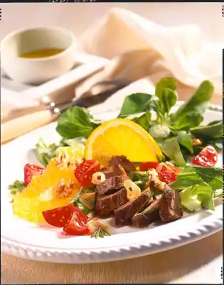 Heat 1 tablespoon of oil in the frying fat. Roast the nuts in it. Deglaze with orange juice and vinegar. Season with salt, pepper and some sugar. Fold in 2-3 tbsp. nut oil. Cut the lamb filet into slices. Mix the salad ingredients with the marinade.
