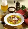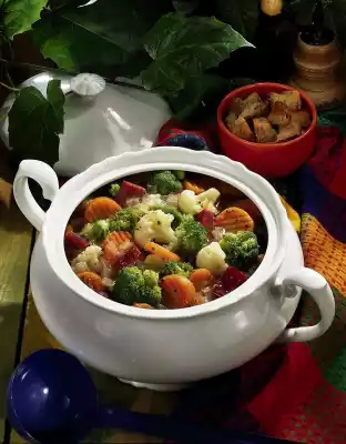 Peel and chop the onions. Heat the oil in a pot. Fry the onions in it until transparent. Add vegetables and broth and bring to the boil. Cover and cook for about 15 minutes. In the meantime, cut the sausage into cubes and add to the vegetables about 5 minutes before the end of the cooking time.