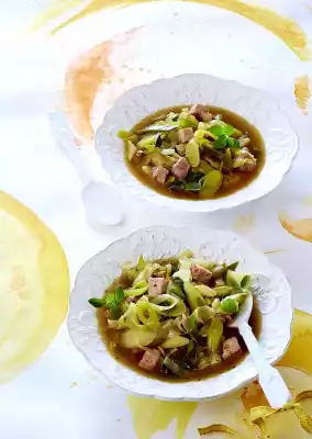 Wash cured pork, cut from the bone, cut the meat into cubes of approx. 1-1.5 cm. Peel and finely dice the onion. Clean and wash the leek and cut into diagonal rings. Celery clean, wash, peel and finely dice.