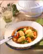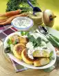 Season with salt and pepper. Deglaze with stock, simmer for 5 minutes. Add cream and cheese. Wash herbs, chop finely, add. Add sauce thickener, bring to the boil. Heat tomatoes in it. Season to taste with salt and pepper.