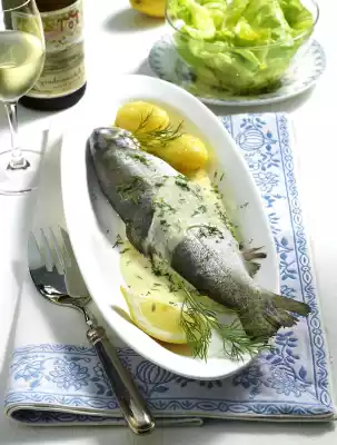 Arrange the trout with the Riesling cream and garnish. Serve with boiled potatoes and green salad