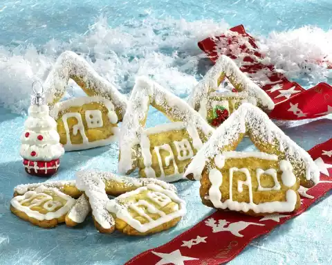 Bake in a preheated oven (electric cooker: 200 °C/ convection oven: 175 °C/ gas: level 3) for 10-12 minutes. Cool down on a cake rack. To decorate, beat 1 egg white and icing sugar until stiff. Pour into a freezer bag and cut off a small corner. Decorate the little house with it, let it dry. Dust with icing sugar