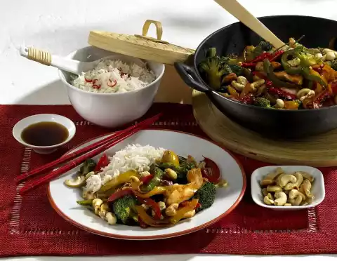 Add soy sauce and stock, simmer for about 5 minutes. Stir the starch with a little water until smooth, thicken the sauce with it. Add meat and heat up briefly. Season to taste with salt and pepper if necessary. Sprinkle with cashew nuts.