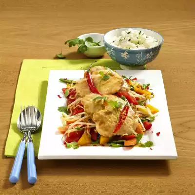 Finally add coriander and season the vegetables again. Remove vegetables from the wok and keep warm. Drain the rice. Heat 1 teaspoon of oil in the wok. Season the escalopes with salt and pepper and fry them in the wok for 1-2 minutes on each side. Add the chilli halves shortly before the end and fry with them. Arrange the vegetables on a plate and place the schnitzels on top of the vegetables. Garnish cutlets with coriander and chilli