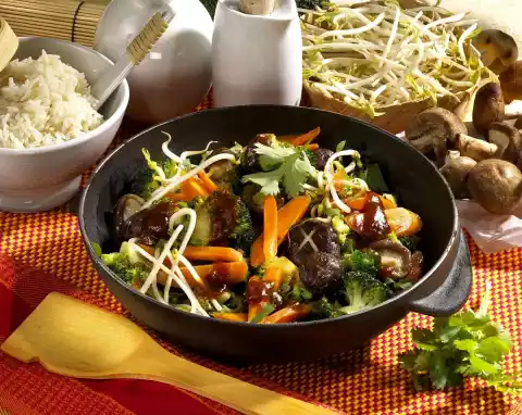 Add carrots and broccoli and fry for about 5 minutes. Add the shiitake to the wok and fry for another 5 minutes. Add sprouts and deglaze with stock and soy sauce. Simmer for about 3 minutes. Stir in Sambal Oelek and season with salt and pepper.