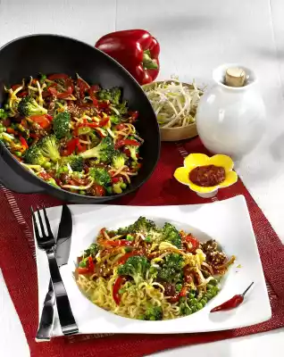 Sauté the meat in it, season with salt and pepper, put aside. Stir-fry peppers and broccoli in the wok for approx. 4 minutes. Season with salt, ginger and sesame. Add peas and meat. Deglaze with soy sauce. Fold in sprouts, season again and season with Sambal Oelek. Serve with the noodles in portions
