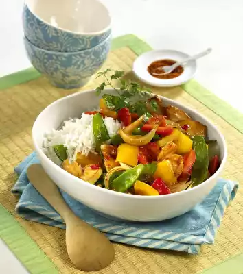 Heat 1 tablespoon of oil in the frying fat. Fry onions and peppers for about 5 minutes, sugar snap peas and bamboo for about 2 minutes. Add meat and heat. Season to taste with soy and Asian sauce. Rice (e.g. basmati) goes well with it