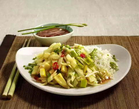 Prepare rice in boiling salted water according to package instructions. Clean, wash and cut cabbage into strips. Slice the corn on the calves and cut the bamboo shoots into pieces. Clean, wash and cut leek into rings. Clean chilli pepper, cut lengthwise, remove seeds. Wash the pod and cut into rings. Heat oil in a pan or wok.
