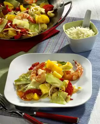 Wash the shrimps, dab dry, possibly defecate. Fry in hot oil in a large pan or wok for about 2 minutes on each side. Season with salt and pepper and remove. Fry cabbage in the frying fat while turning for 6-8 minutes. Fry onions and peppers for 2-3 minutes. Season with salt. Add sprouts and pineapple