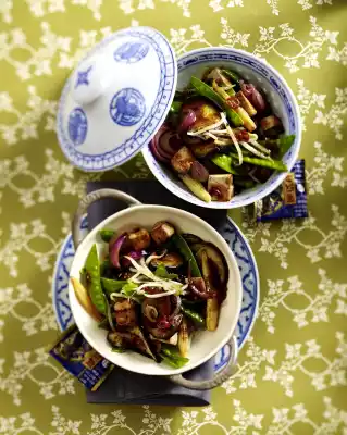 Chill for at least 1 hour. Drain the corn on the veal and cut it in half lengthwise. Wash the sprouts. Clean the aubergine and cut into slices of about 1 cm thick. Peel and slice the onions. Heat 2 tablespoons of oil in a wok or frying pan. Fry the aubergines, sugar snap peas and onions for about 8 minutes while turning. After 4 minutes add the tofu with the marinade. Add sprouts 1 minute before the end of cooking time.