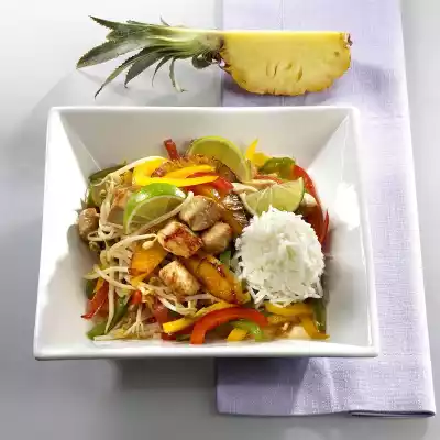 Place rice in boiling salted water and cook over low heat for 12-14 minutes. In the meantime clean, wash and cut the peppers into strips. Wash the turkey, dab dry and cut into cubes. Cut pineapple into pieces. Heat sesame oil. Fry the diced turkey in it, turning it golden brown. Season with salt and pepper.