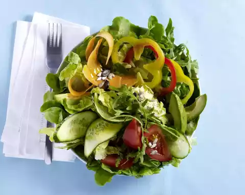 Arrange peppers, avocado, tomato, cucumber and salad on a plate. Sprinkle lettuce with seeds and seeds and sprinkle with dressing.