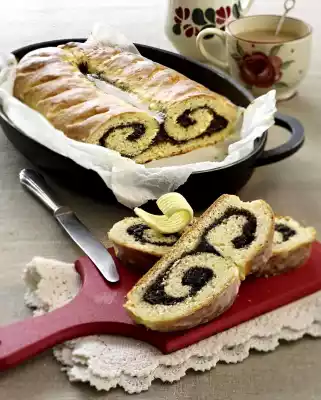 Mix the poppy seed filling and 1 egg. Lightly dust a large sheet of baking paper with flour. Roll out the dough into a rectangle (approx. 40 x 45 cm). Spread the poppy seed mixture on the dough, making the edges slightly thinner. Now roll the dough from the two long sides towards the middle. Press the two end sides (narrow sides) well together. Cut both strands slightly at regular intervals. Lift the wrapped cake on the baking paper into a flat roasting pan or a roasting lid. Bake in the preheated oven, 2nd rail from below (electric oven: 175 °C/ convection oven: 150 °C/ gas: level 2) for approx. 50 minutes. Mix egg yolk and cream. After approx. 30 minutes spread the cake with the egg yolk and cream