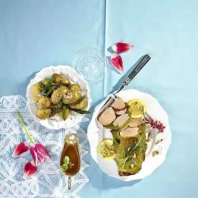 Increase oven temperature (electric cooker: 225 °C/ circulating air: 200 °C/ gas: level 4). Remove kitchen thread from the meat. Brush fillet with the herb paste. Bake in the oven for another 5-10 minutes. Bring the meat to the boil. Stir cornflour and 2 tablespoons of cold water until smooth and thicken the stock. Bring to the boil while stirring, season to taste with salt and pepper and refine with cream. Garnish fillet roast and sauce with fresh herbs, lemon, roasted pine nuts and pink berries. Serve with asparagus and potatoes sprinkled with coarse salt