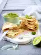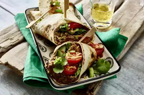 Place the flat cakes side by side on a work surface. Place a strip of bean hummus in the middle. Arrange lettuce, tomatoes, onions and cucumber on top. Sprinkle with roasted onions and roll up tightly. Cut the wraps diagonally in half and pin them with wooden skewers.