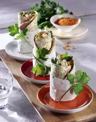 Place 2 flat cakes slightly on top of each other and cover with 2 slices of ham each. Spread the prepared filling on top. Roll up tightly, fold the lower openings inwards. Wrap with parchment paper and fix with wooden sticks. Serve garnished with parsley
